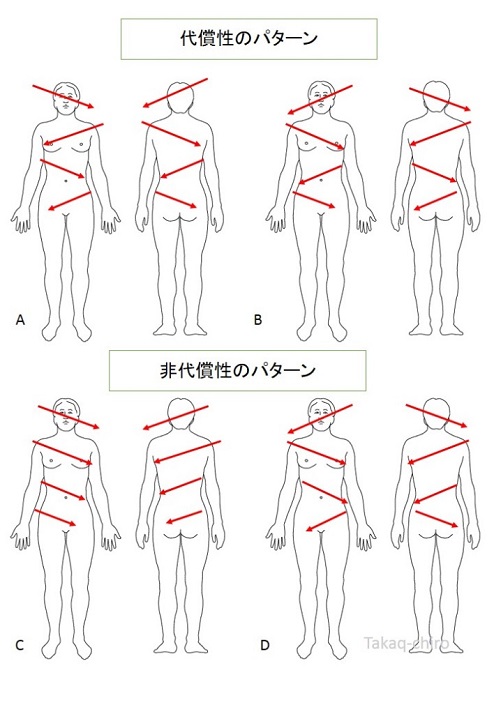 非代償性のパターン(不調を持つ方、不調になりがちな人) → 同じ方向に連続してねじれるパターン